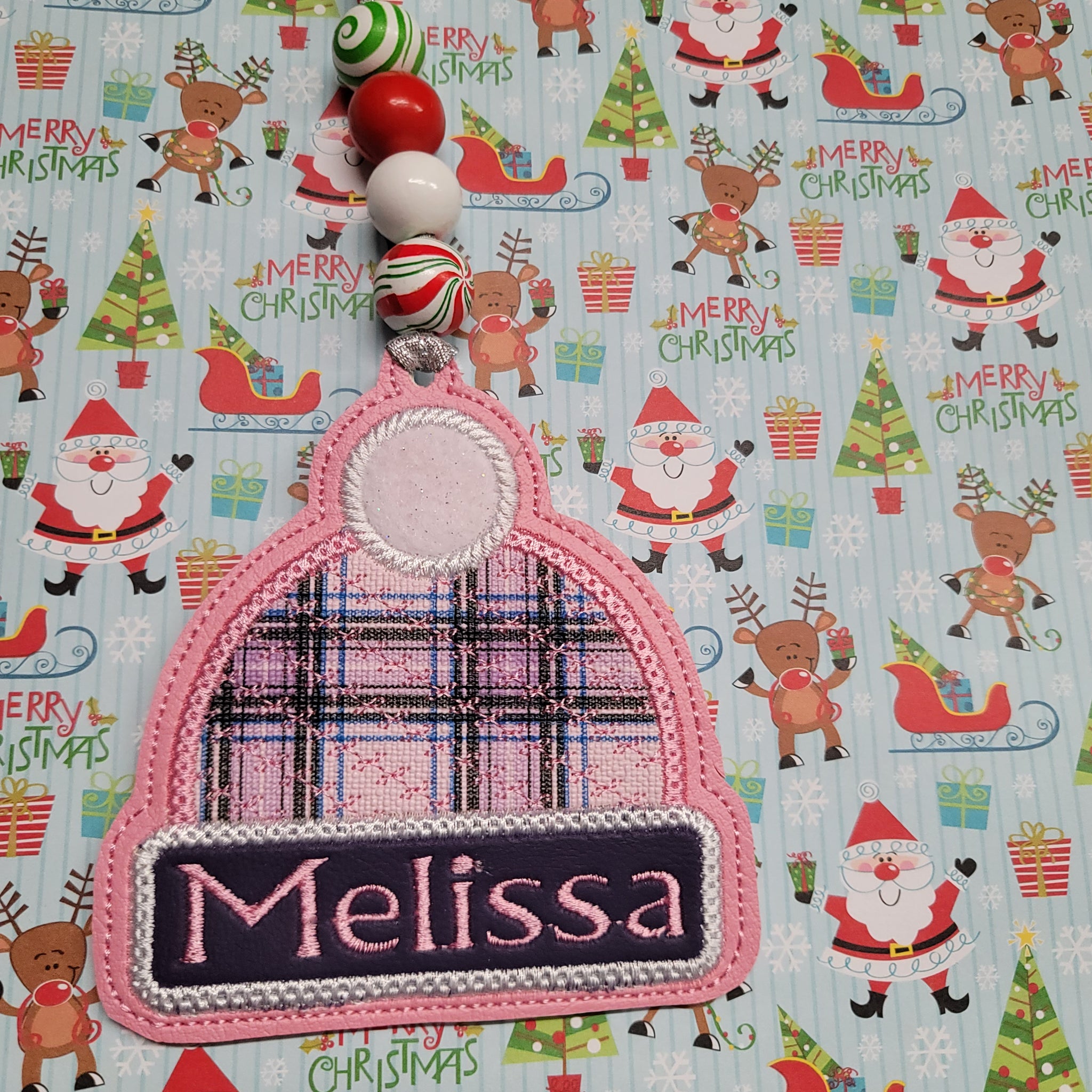 This is a cute pink plaid Beanie hat ornament personalized with name. Made out of vinyl on a embroidery machine .