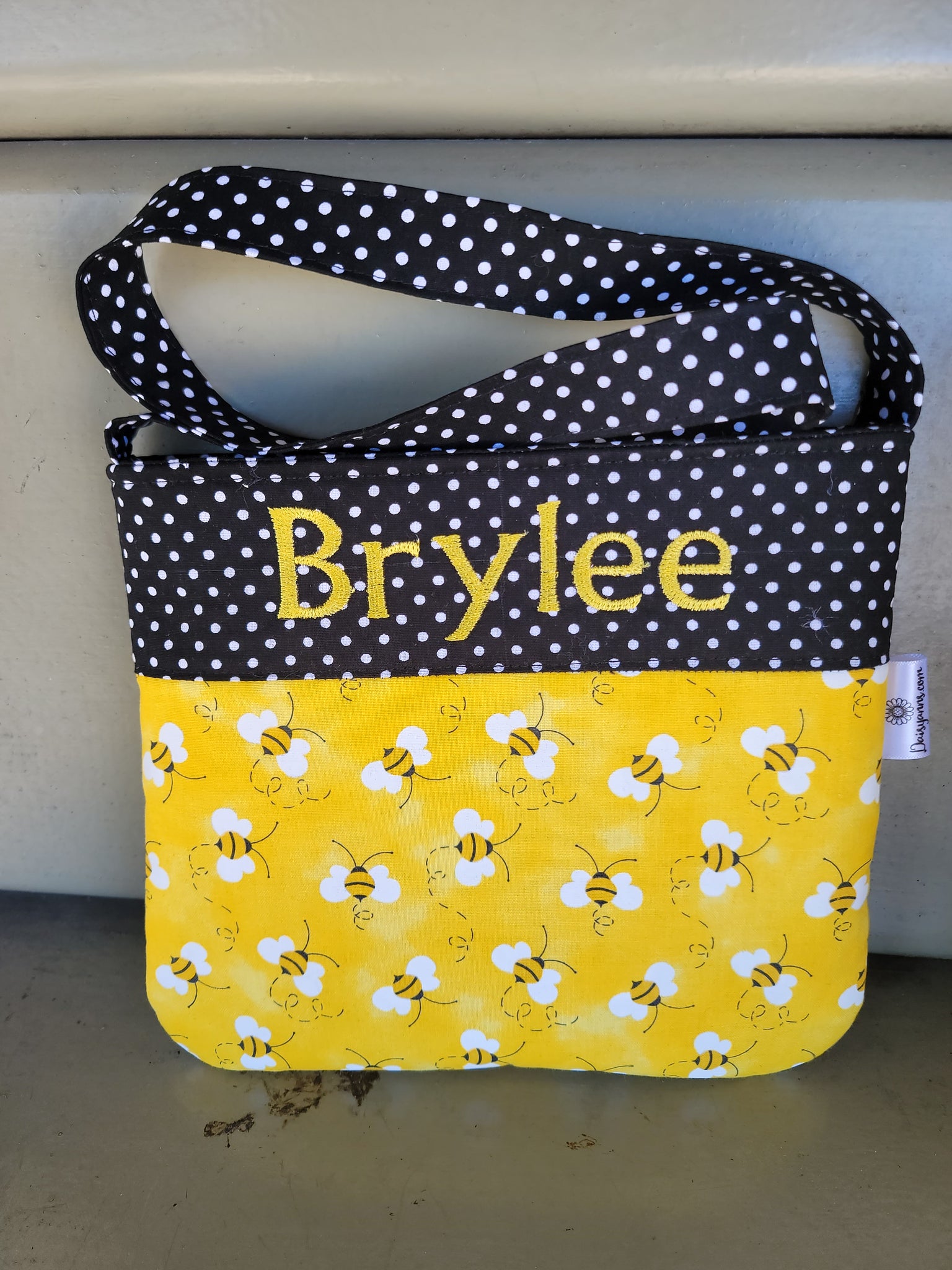 This Bee with black and white polka dot purse can be personalized with name for additional cost $6.00. Up 10 letters.