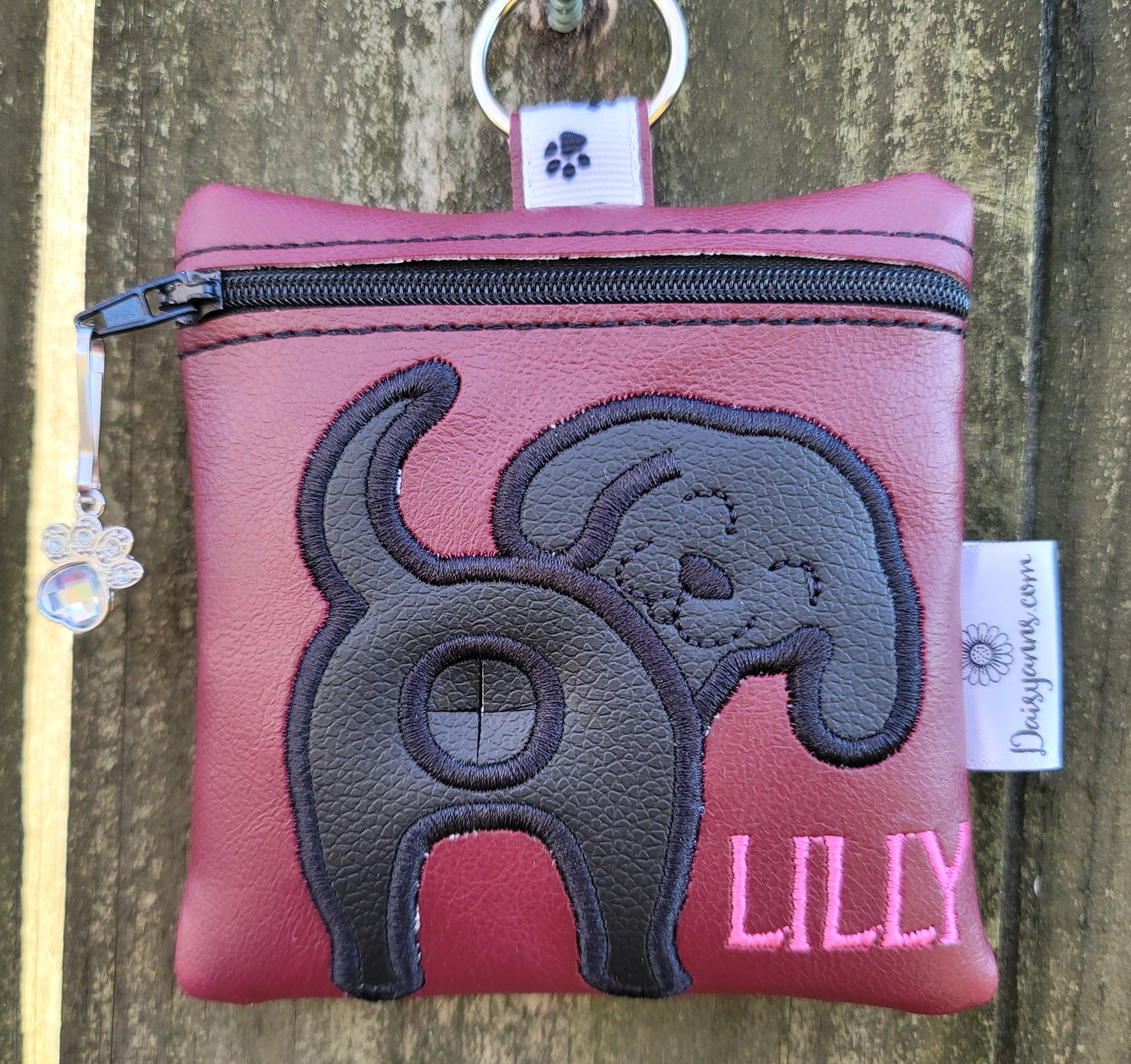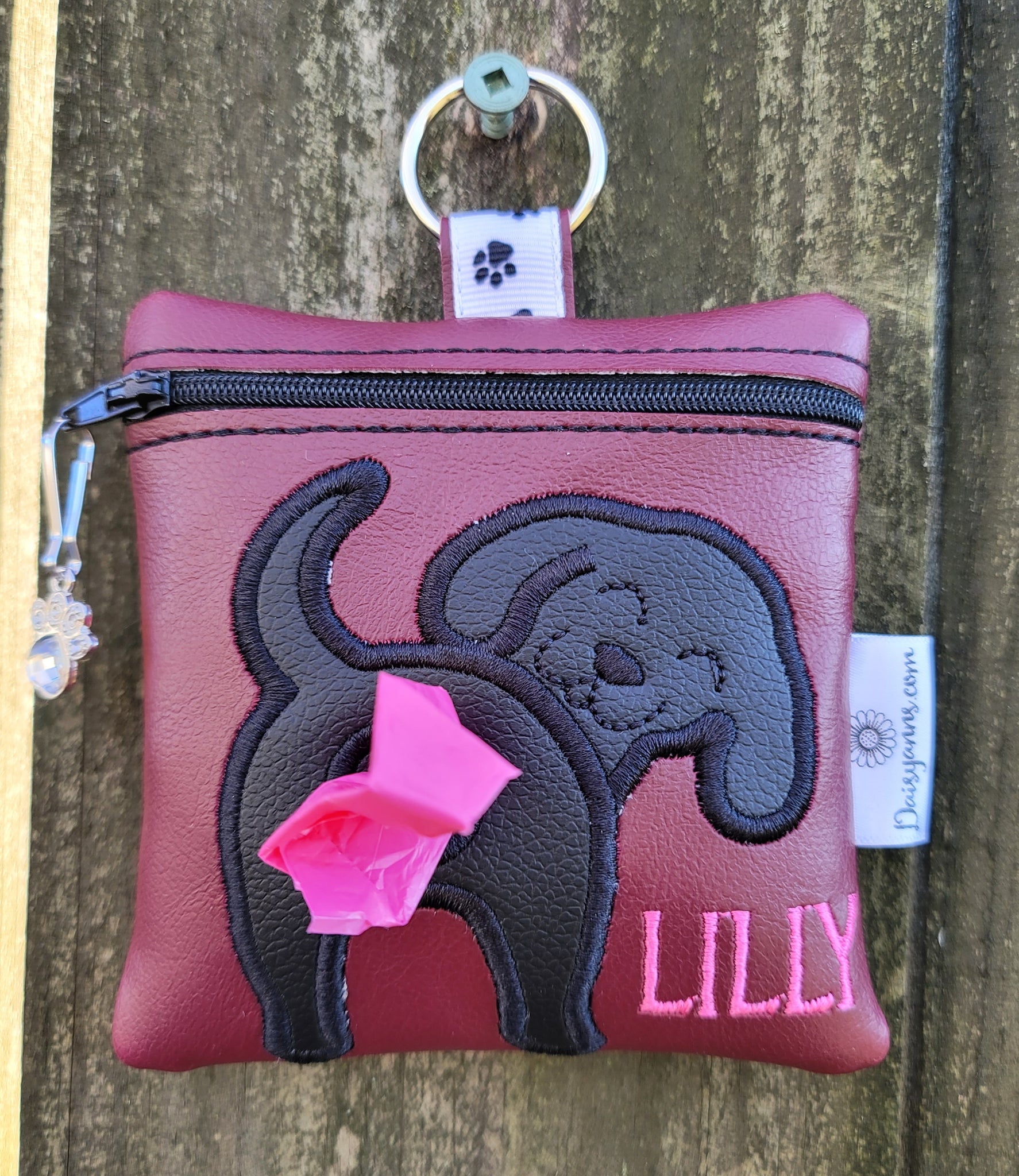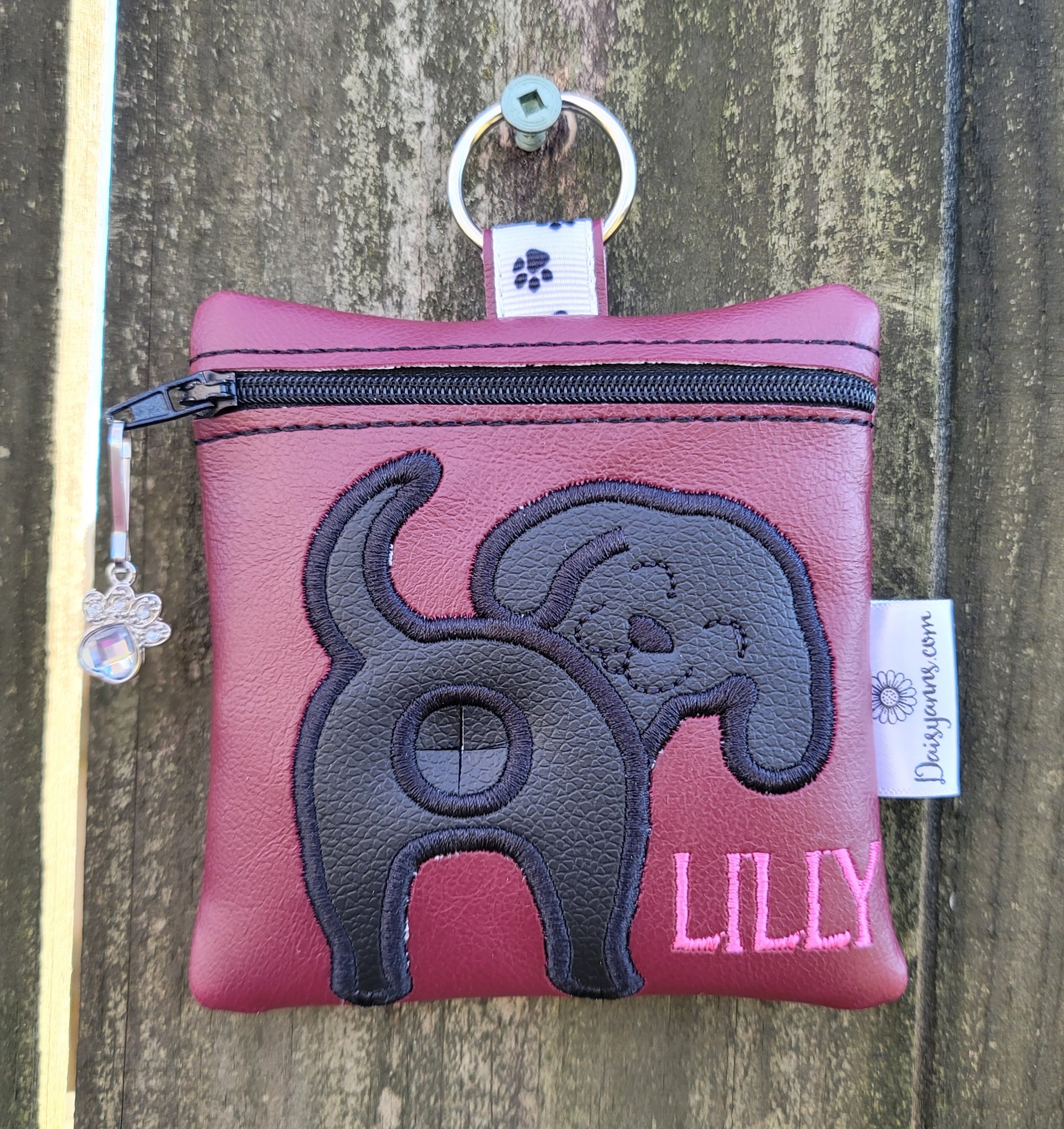 Personalized Black Lab dog poo bag. You can add your pets name. Pick the color of embroidered name. $5.00 up-charge for custom embroidery choice. maximum 7 letters.