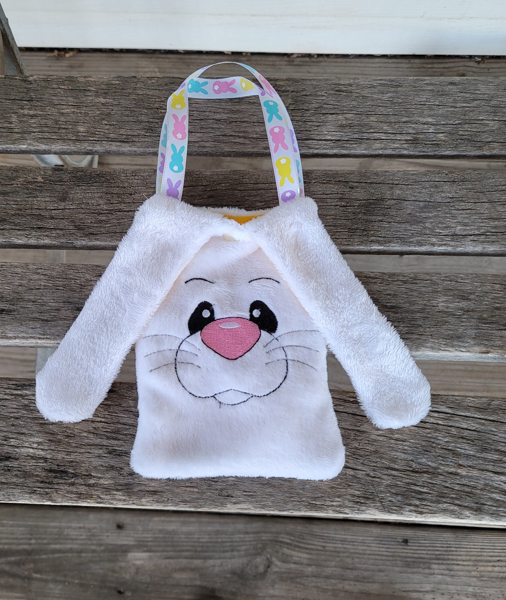 This Easter bunny bag is made with an embroidery machine that can be personalized with a name. Can be personalized with pink embroidery thread or blue color.