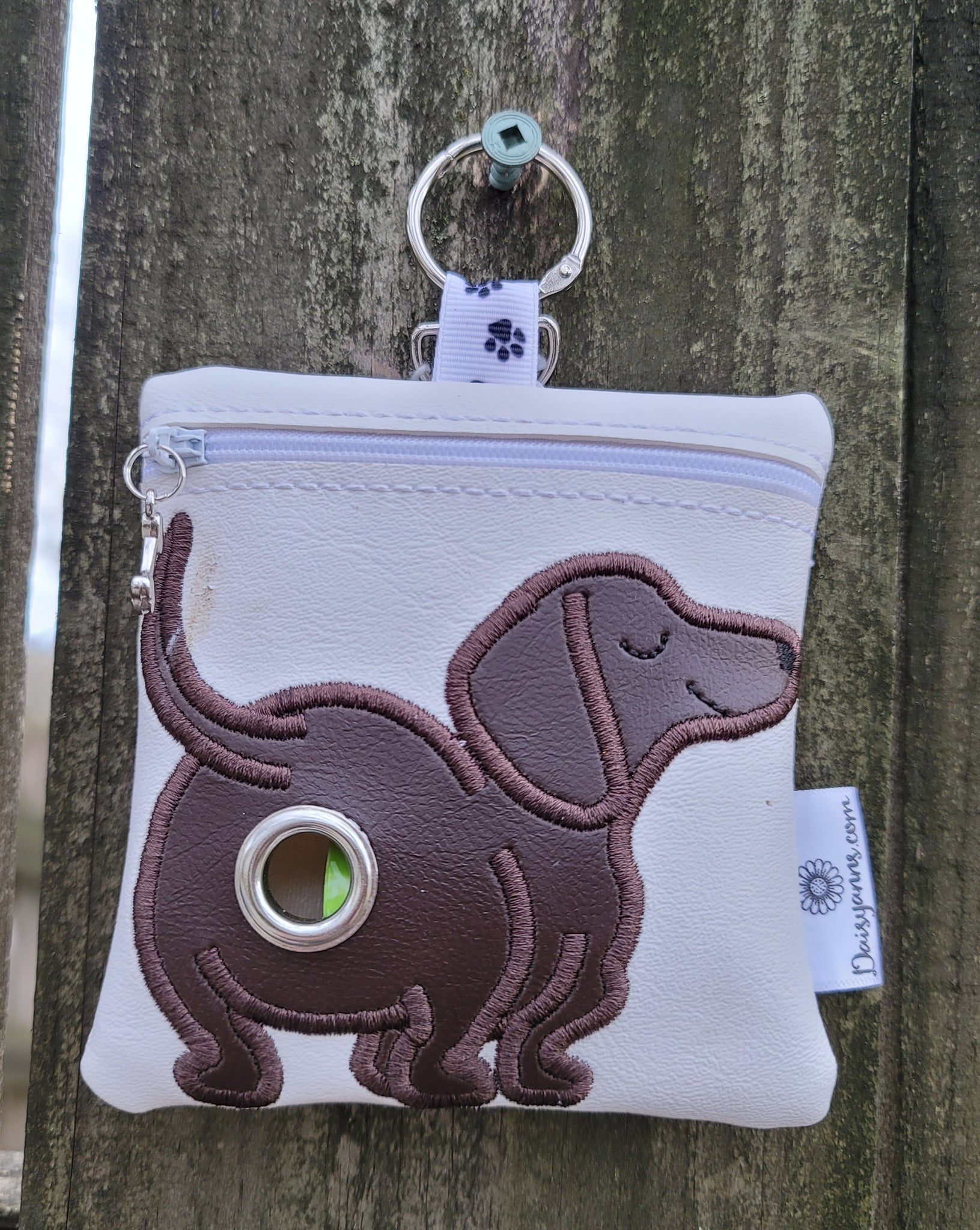 Personalized brown dachshund dog poo bag. You can add your pets name. $5.00 up-charge for custom embroidery choice. maximum 7 letters.